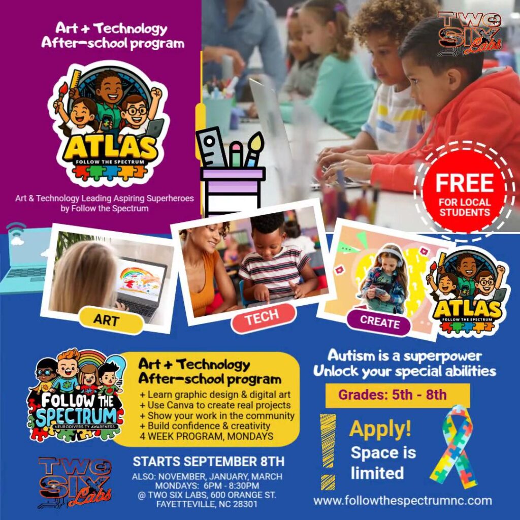 ATLAS (Art & Technology Leading Aspiring Superheroes) is an after-school program created by Follow the Spectrum in partnership with Two Six Labs. The program provides students with disabilities the opportunity to explore self-expression through art and technology, with a focus on graphic design using Canva. Students will develop creative projects they can share both in the classroom and in the community.