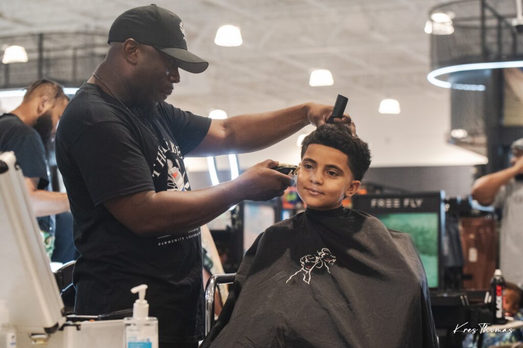 Local barbers volunteered their time to provide free haircuts, while additional vendors offered resources and giveaways. Outside the venue, children enjoyed exploring a race car on display, with driver Tyler Sealey greeting families.